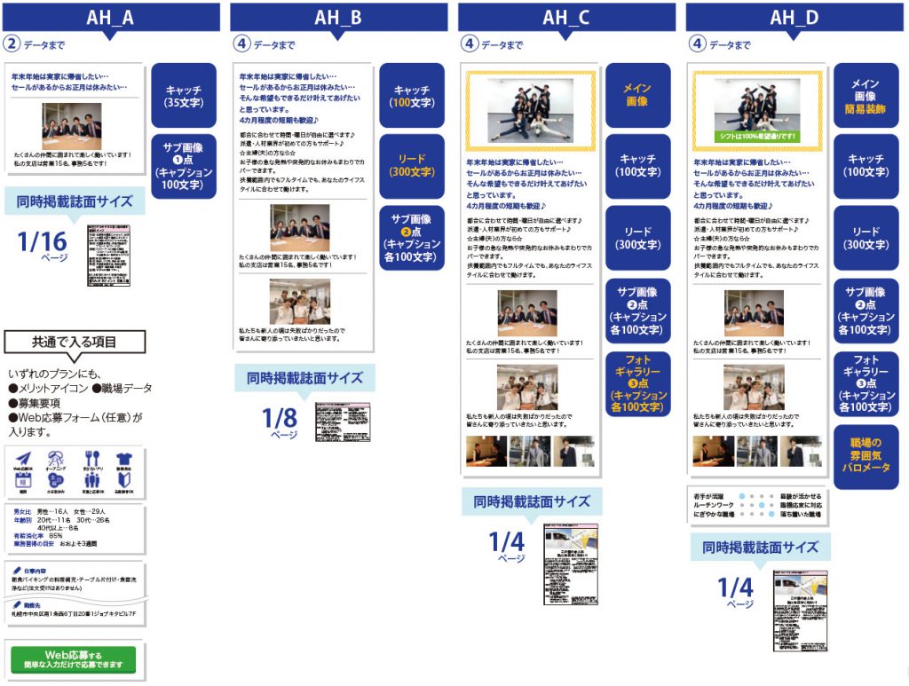 PC・スマホ対応のWebサイトは、仕事、勤務地、勤務時間、フリーワードなど多彩な検索機能で最適な人材を誘導。A4サイズのフリーペーパーは札幌・近郊のスーパーや大学など約1,100カ所で無料配布し、オンラインとオフライン双方から幅広い層にアプローチできます。認知拡大と応募促進を同時に実現します。