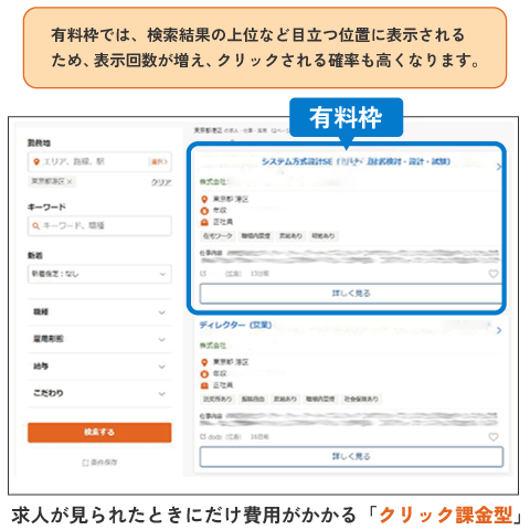 そこで求職者の目に留まりやすくなるように、有料掲載という方法で表示回数を増やします。