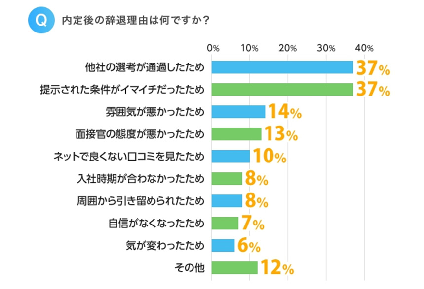 2022年のエン・ジャパン株式会社の調査によると、売り手市場の傾向が強い現在において、内定辞退の理由として最も多いものの1つが「他社の選考を通過したため」です。