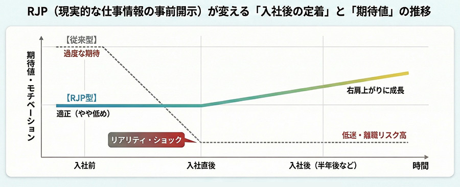 RJPは、このギャップを事前になくすことで、定着率と職務満足度を高めることを目的としています。