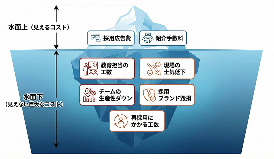 人材紹介フィーや求人広告費といった直接的な採用コストに加え、入社後の研修費、PC等の設備費、社会保険料などがすべて無駄になります。一般的に、早期離職による損失額は、その社員の年収の3分の1から半分以上にのぼると言われています。