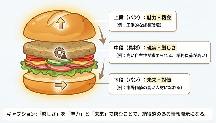 RJPの最大の注意点は、「単なる自虐や脅し」になってはいけないということです。ネガティブ情報は、必ずポジティブ情報とセットで伝え、候補者が「挑戦する価値」を感じられるように設計する必要があります。