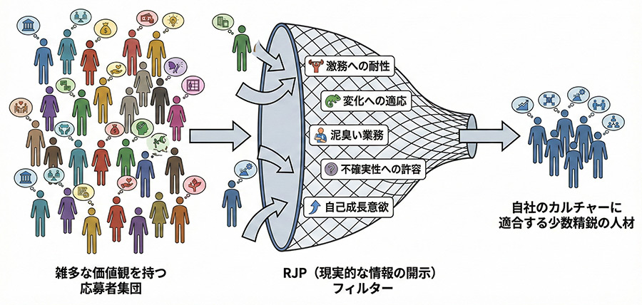 しかしRJPとして「決定事項が翌日に覆ることも日常茶飯事なので、変化を楽しめない人にはストレスになる」と具体的に伝えた場合、安定を好む人は辞退し、変化を好む人だけが残ります。