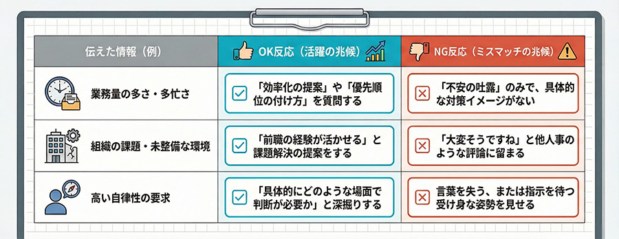 どれほど正確な情報を用意しても、伝え方を間違えれば候補者を無駄に不安にさせるだけですし、伝えた後の「相手の反応」を見逃しては、RJPの効果は半減してしまいます。