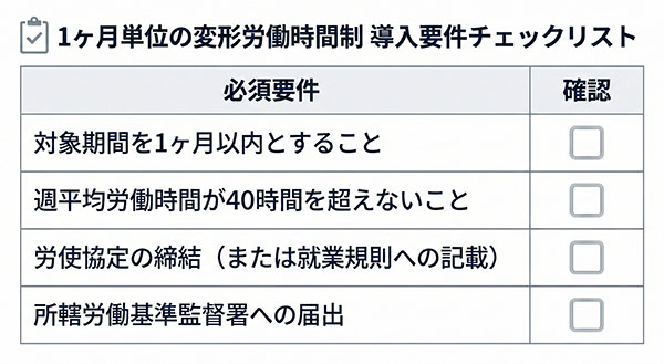アンケート結果に基づき、導入パターンを確定します。ここで重要なのが「1ヶ月単位の変形労働時間制」の採用検討です。