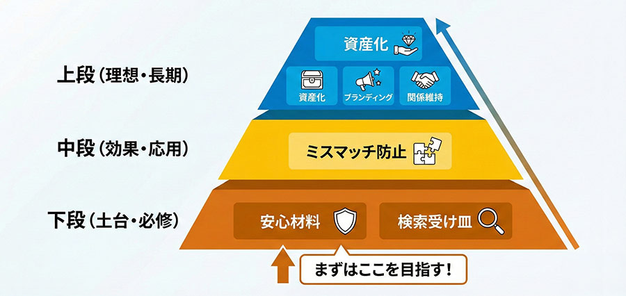 先ほどのセクションで紹介した「必修(安心材料)」と「応用(ミスマッチ防止)」のうち、自社はまずどこを目指すのかを決めます。