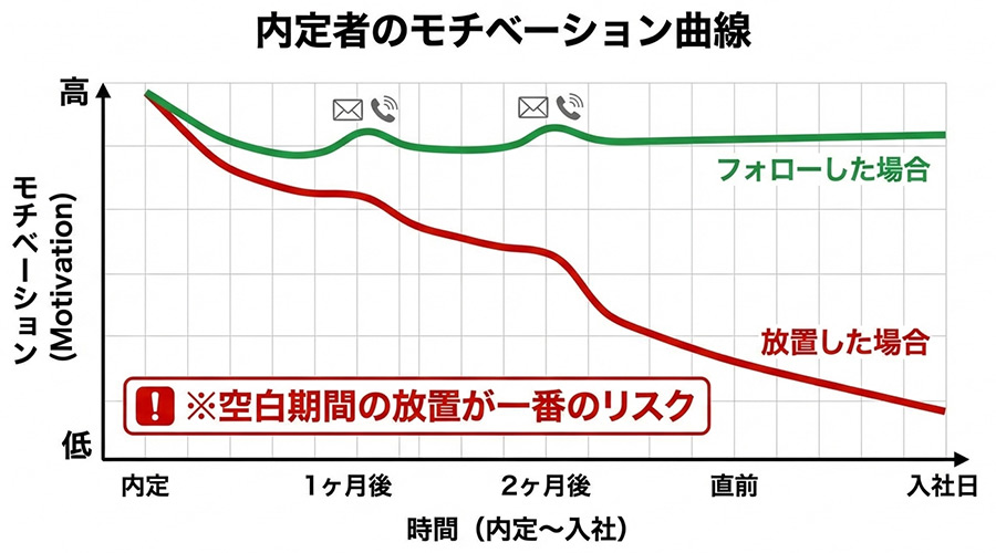 内定承諾をもらって安心し、入社までの期間に企業とのコミュニケーションが不足すると、候補者は「内定ブルー」に陥りやすく、現職からの引き留めや他社の誘惑に負けてしまいます。