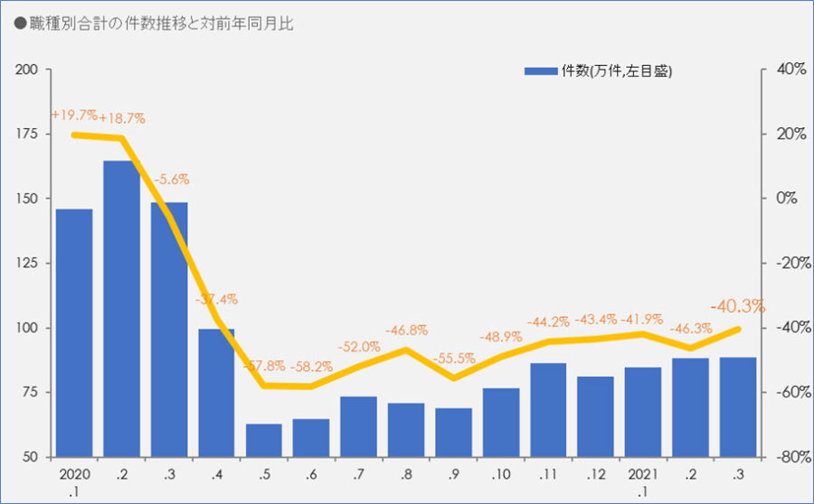 公益社団法人全国求人情報協会が発表した2021年3月の職種分類別件数は、全体で886,986件(前年同月比-40.3%)でした。