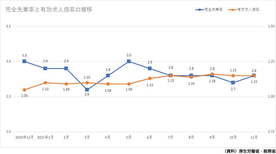 また、総務省が同日発表した11月の完全失業率(季節調整値)は、2.8%で、前月に比べ0.1ポイントの上昇となりました。