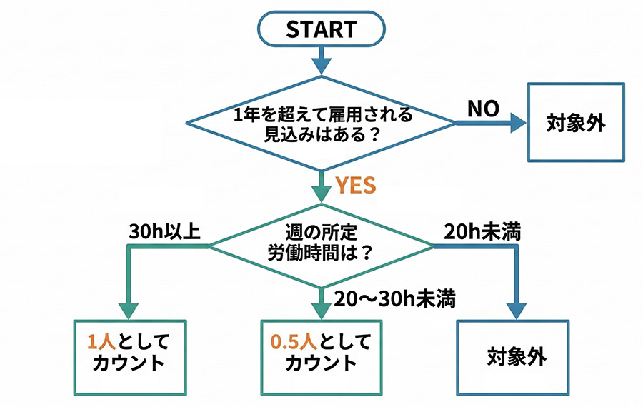| 20時間以上 30時間未満 | 0.5人 | 時短勤務の社員、週3日・1日7時間勤務のパートなど |