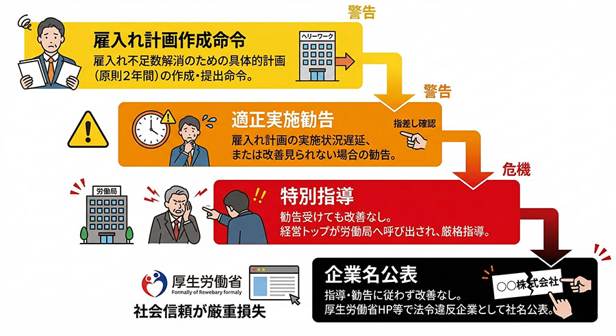 「自社は100人以下だから納付金はかからない。急がなくても大丈夫だろう」と考えるのは非常に危険です。常用雇用労働者数37.5人以上となるすべての義務対象企業には、ハローワーク等の行政機関による厳格な指導と、最終的な「企業名公表」のリスクが等しく存在します。