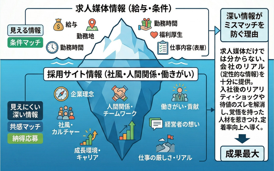 これらの「定性的な情報」を十分に提供し、求職者の理解度(質)を高める役割こそが、求人媒体とは別に「採用サイト」が必要とされる理由なのです。
