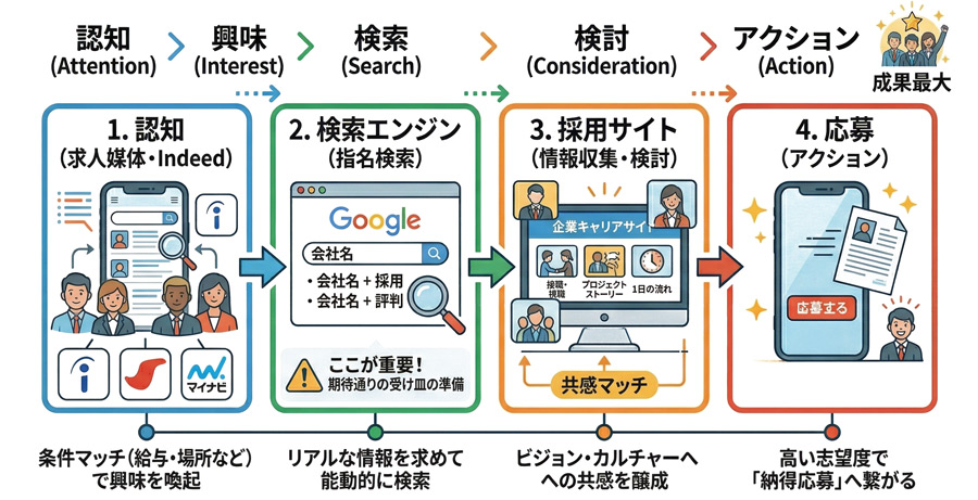 採用成功のカギは、求人媒体と採用サイトを独立させるのではなく、求職者の「情報収集フロー」に合わせて連携させることにあります。