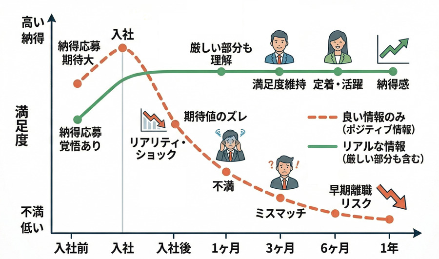 ポジティブな情報だけでなく、仕事の厳しさや課題も含めた「リアルな情報」を開示し、入社後のリアリティ・ショック(幻滅)を防ぐ役割です。