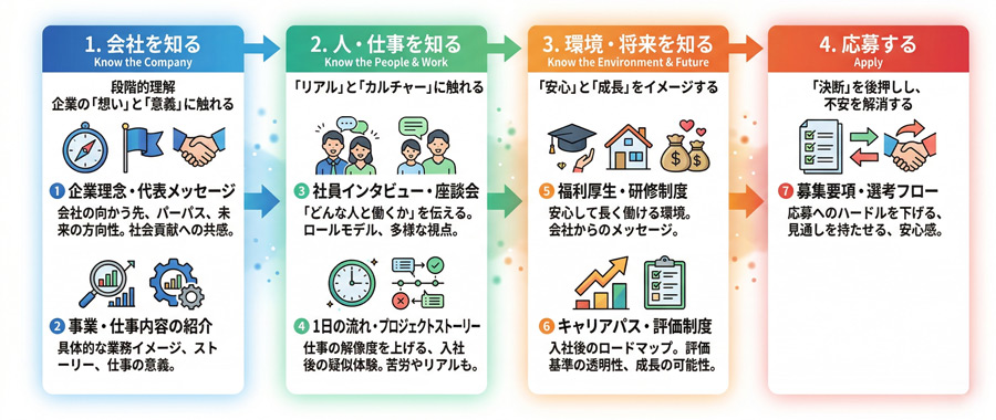 採用サイトのコンテンツは、求職者の「応募ボタンを押す」という決断を後押しし、かつ「入社後のギャップ」を埋めるための重要な判断材料であるべきです。