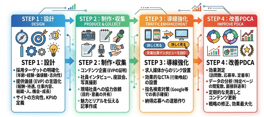 ここからは、採用担当者が明日から具体的な行動に移せるよう、採用サイトを戦略的に活用するための「4つのステップ」を解説します。