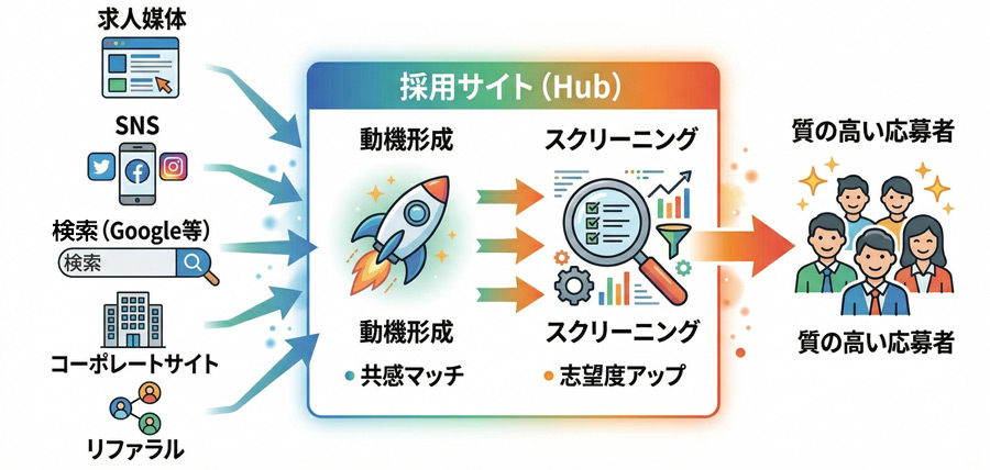 自社の魅力とリアルを伝え、求職者の動機づけを深め、採用ブランディングを確立する「採用戦略のハブ(中心拠点)」です。
