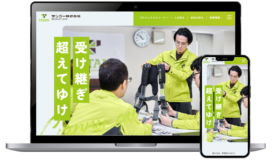 建設現場の墜落制止用器具(安全帯)のパイオニアであるサンコー株式会社(タイタン)の採用サイトは、単なるモノづくりではなく、「命を守る仕事」であるというメッセージを一貫して伝えています。