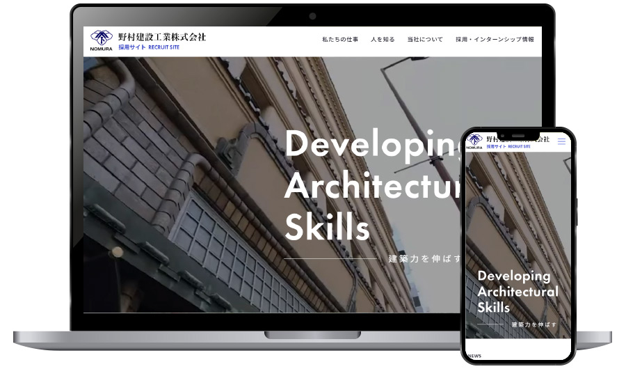 野村建設工業の採用サイトは、旧野村財閥系という安定基盤をアピールしつつ、働きやすさを「数字」で可視化することで、安心感を醸成しています。