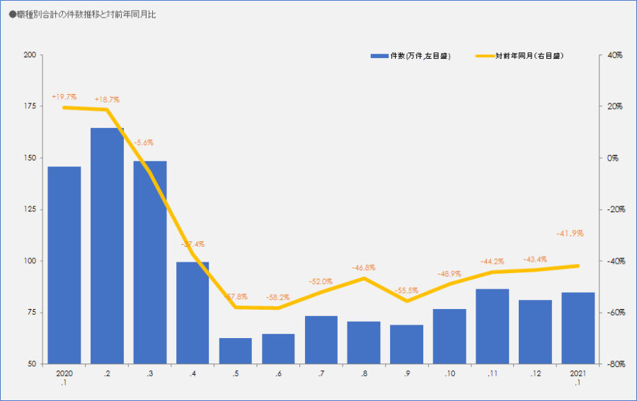 公益社団法人全国求人情報協会が発表した2021年1月の職種分類別件数は、全体で848,362件(前年比-41.9%)でした。前年比の下げ幅は昨年9月以降、ゆるやかに改善していますが、依然として前年の半分にも満たない数字で推移しております。