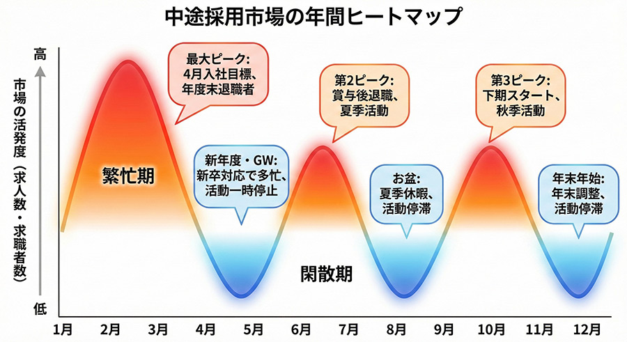 中途採用が落ち着く時期=競合する企業が少ない時期をあえて狙って採用活動を実施するのも、一つの採用戦略と言えるかもしれません。