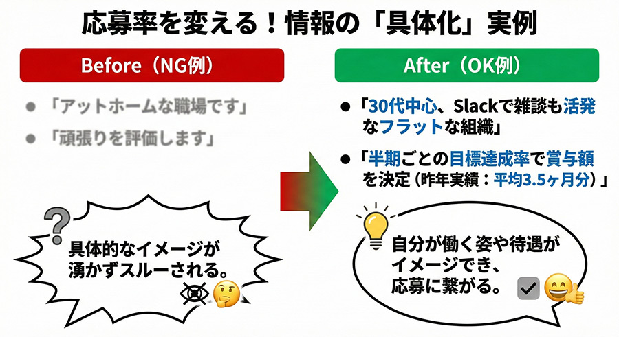 現在の若年層は、働くことに対しても多様な価値観を持っています。企業文化や働く環境、研修制度、また企業が社会に対してどのような価値を生み出しているのかなどを明記し、自分が実際にその会社で働くことをイメージできるような訴求方法が必要になります。