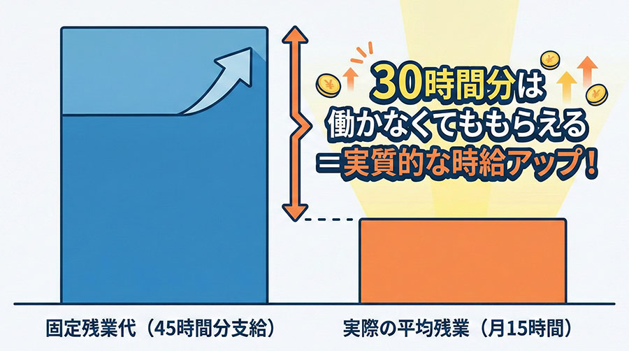 固定残業代の最大のメリットは、「設定された時間枠(例:40時間)より早く帰っても、40時間分の手当がもらえる」ことです。