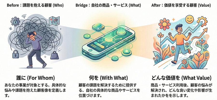 単に「〇〇を販売しています」、「革新的な技術です」という事実だけでなく、「誰の、どんな悩みを解決しているのか」、「この技術が、これまで解決できなかった社会課題の解決にどう貢献しているか」という視点で掘り下げることが重要です。