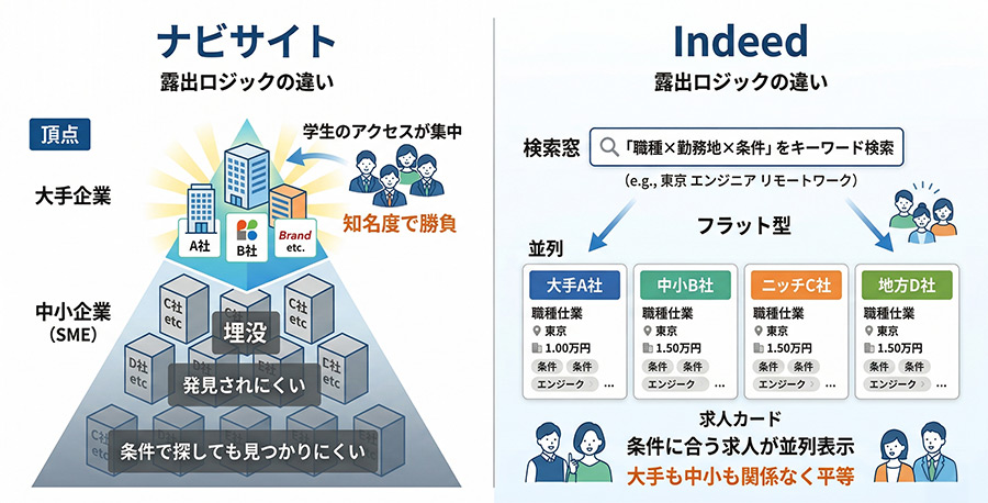 こうした市場変化の中で、Indeedは従来のナビサイトとは異なる「能動的な検索の受け皿」として位置づけられます。