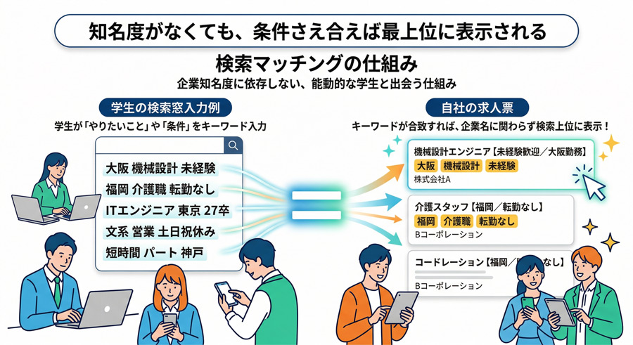 企業側がこの検索行動を逆手に取り、求人原稿に「新卒」や「27卒」というキーワードをしっかり盛り込んでおくことで、以下のような中小企業の「勝ちパターン」が生まれます。