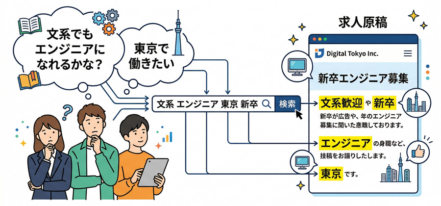 特に中小企業の場合、社名検索は期待できません。「このキーワードを入れたら、うちの求人がヒットするはずだ」という逆算の設計が肝となります。