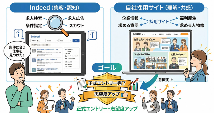 そこで、Indeedを集客の「入り口」、自社採用サイトを説得の「受け皿」として連携させましょう。
