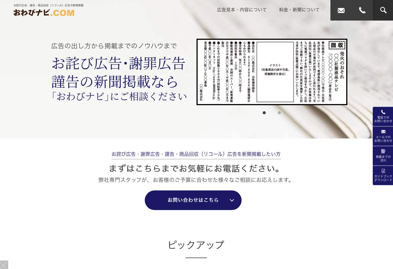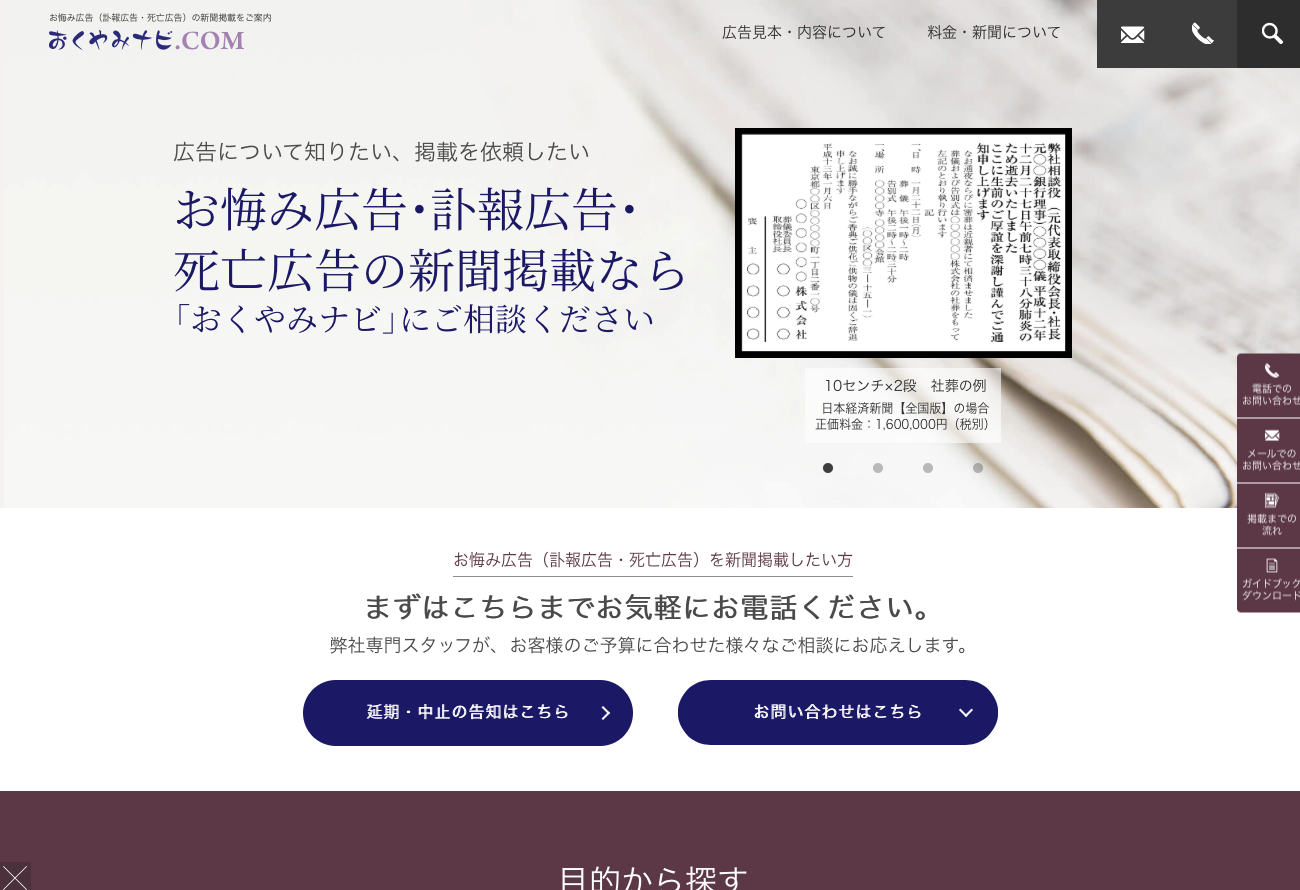 弊社が運営する、新聞広告の掲載料金等がわかる情報サイトです。商品広告や不動産広告など一般的な広告についての「新聞広告ナビ」、商品回収・リコールなどの広告に特化した「お詫びナビ」、葬儀・お別れの会の告知広告に特化した「おくやみナビ」に分かれています。掲載料金など様々な情報を発信しておりますので、参考サイトとしてご活用ください。