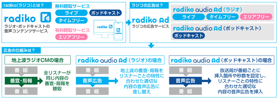 ラジコのラジオ(ライブ・タイムフリー・エリアフリー)では、地上波放送の番組中に各放送局の番宣やお知らせが流れる枠をラジコオーディオアドの音声広告に差し替えて配信します。そのため地上波のCM枠差し替えは行いません。リスナーによって適切な広告を個別配信できるので、ターゲティングに優れています(ライブ・タイムフリーでの広告差し替えを行いますが、ライブ・タイムフリーの配信面は指定できません)。