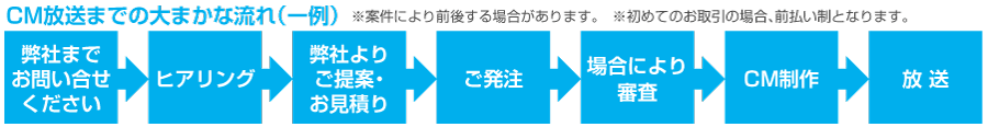 番組(帯番組・箱番組・交通情報)を指定して提供することで、番組開始時/終了時に提供企業名がアナウンスされ、番組中にCMが流れます。毎週決まった時間にCMが流れるだけでなく、曜日指定も可能なため、ブランディング浸透に優れています。番組により1業種1社提供や複数社での共同提供があり、月額料金の複数月契約となります。